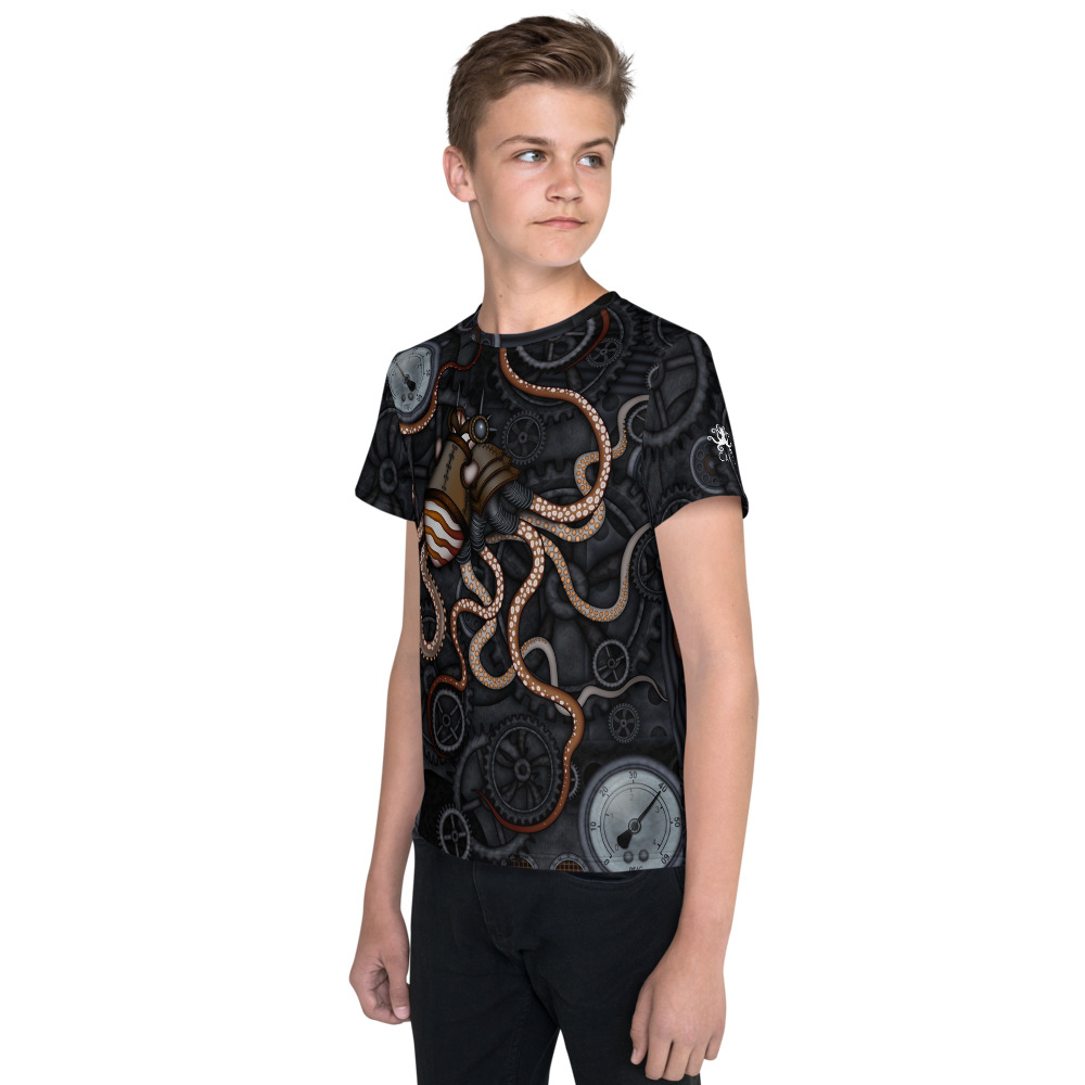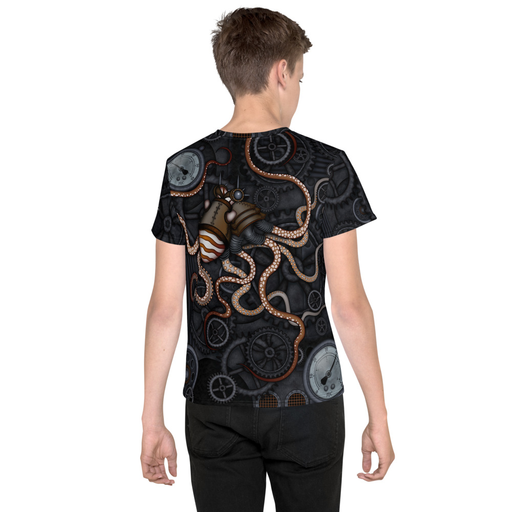 Get a t-shirt that your youth or teen will love! This steampunk octopus tee is a dark, vibrant statement piece that’s made of a soft fabric and has an eye-catching unique design that won’t fade.