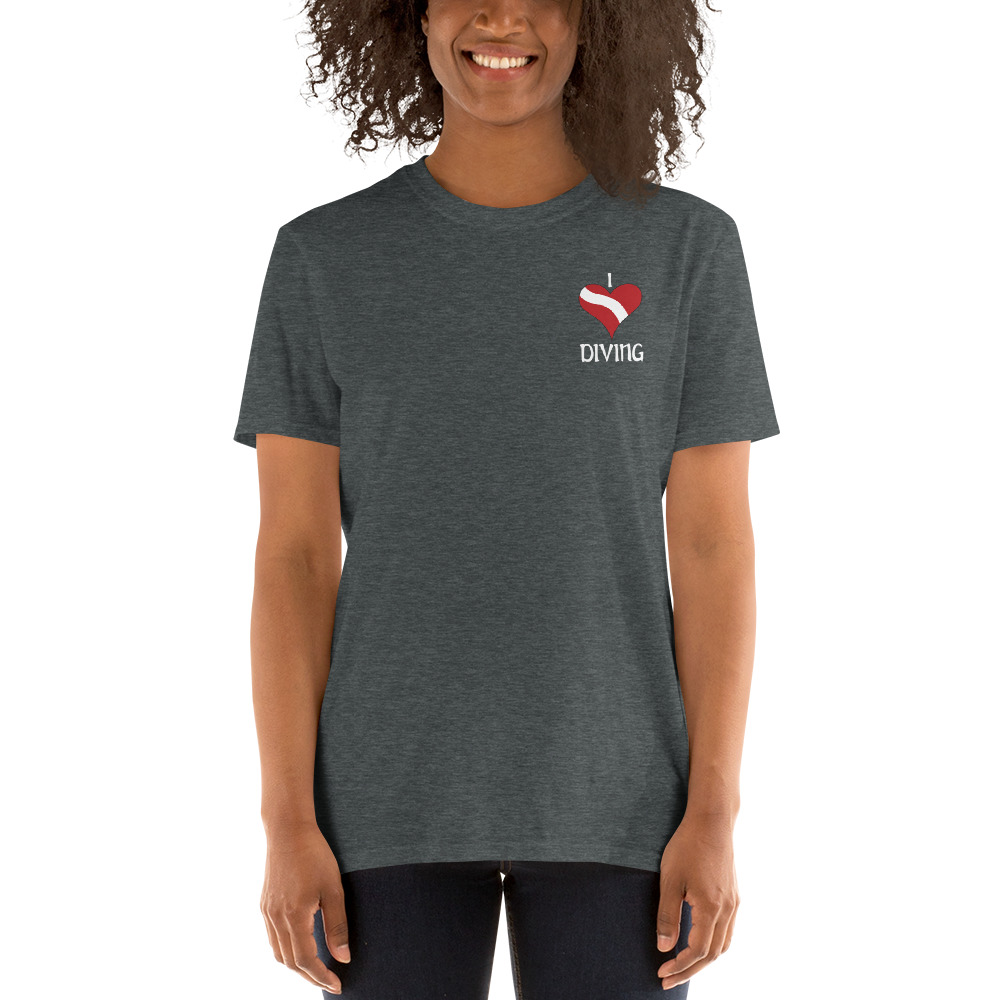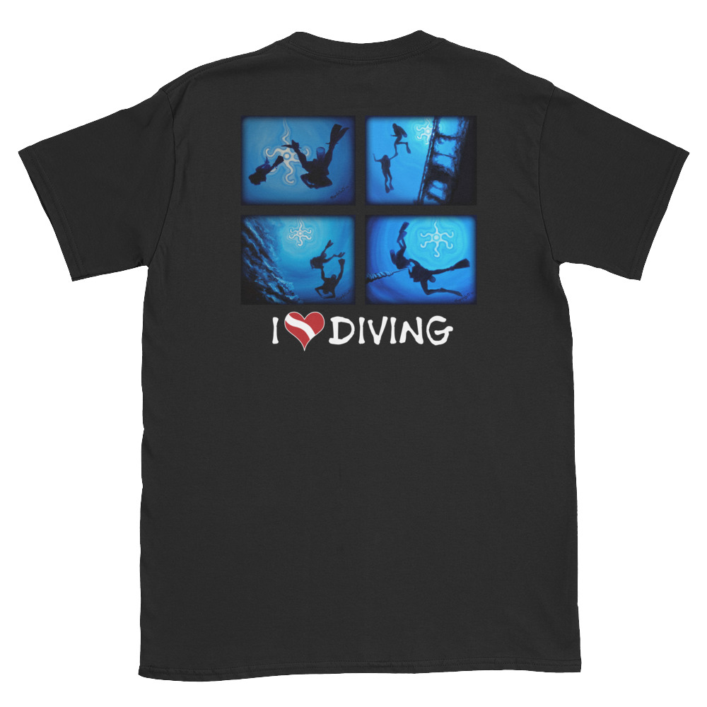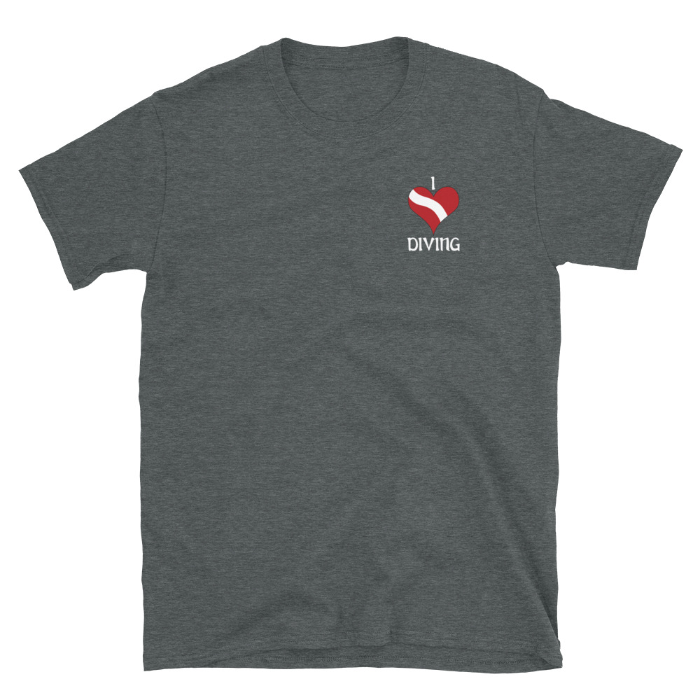 “I Love Diving” with the dive flag heart is on the front. The Scuba Diver silhouettes are on the back.