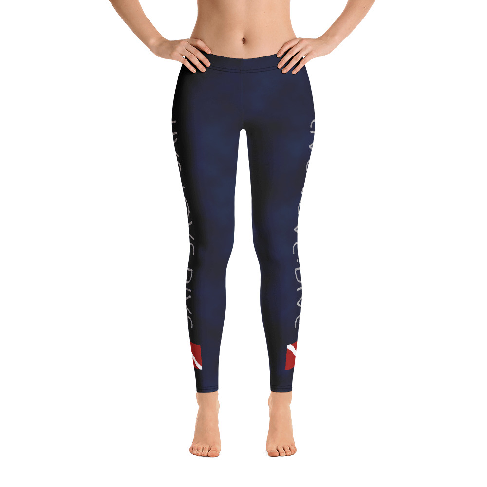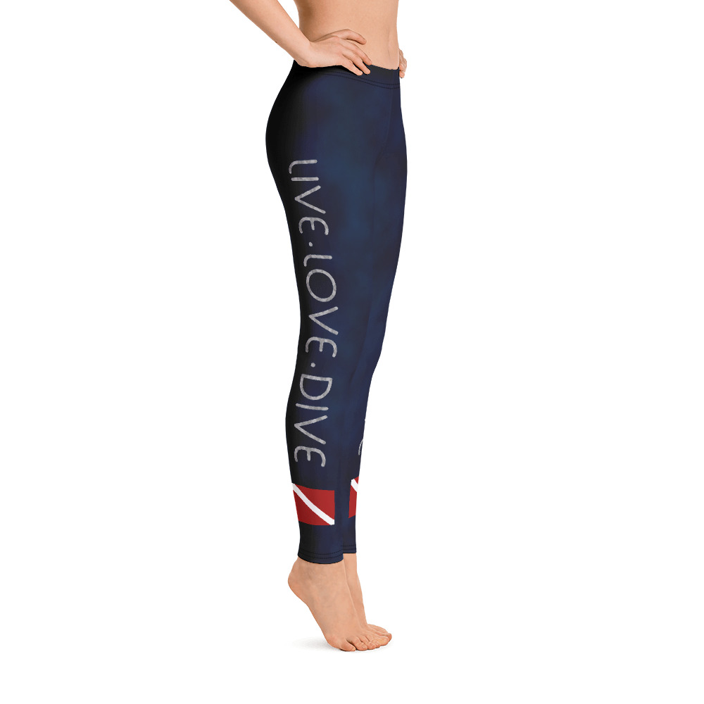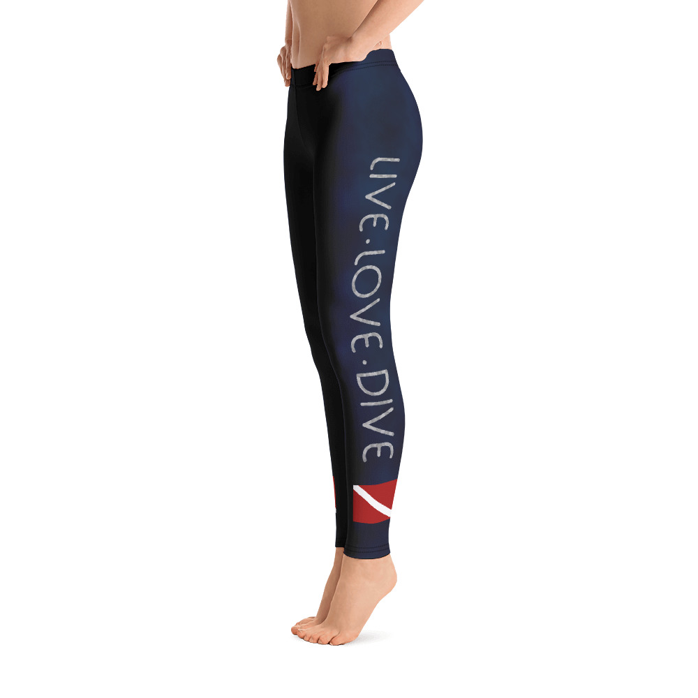 Stylish, durable, and a hot fashion staple with a scuba diving graphic. These polyester/spandex leggings are made of a comfortable microfiber yarn, and they’ll never lose their stretch. The super soft and stretchy material makes them the perfect choice for a variety of activities, and you can wear them on their own or under shorts. The leggings are bound to become your favorite workout apparel! These dive flag leggings are a great, unique choice for warm water diving, snorkeling, water sports and any athletic activity.