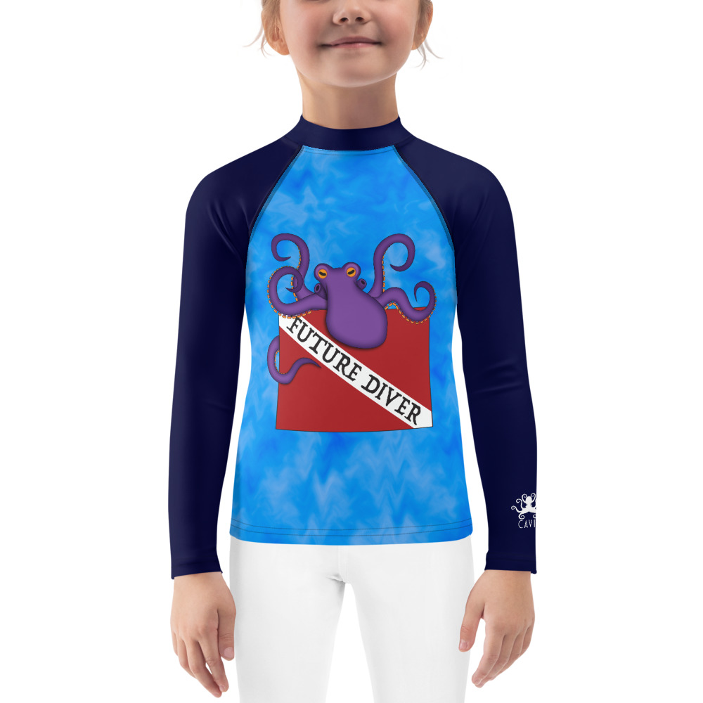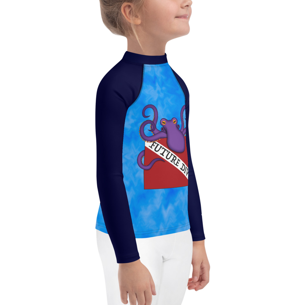 Protect the little ones from the elements with this colorful “Future Diver” purple octopus kids rash guard. Its sun-protective fabric and long body and sleeves make it perfect for running around on the beach, or just being active indoors.