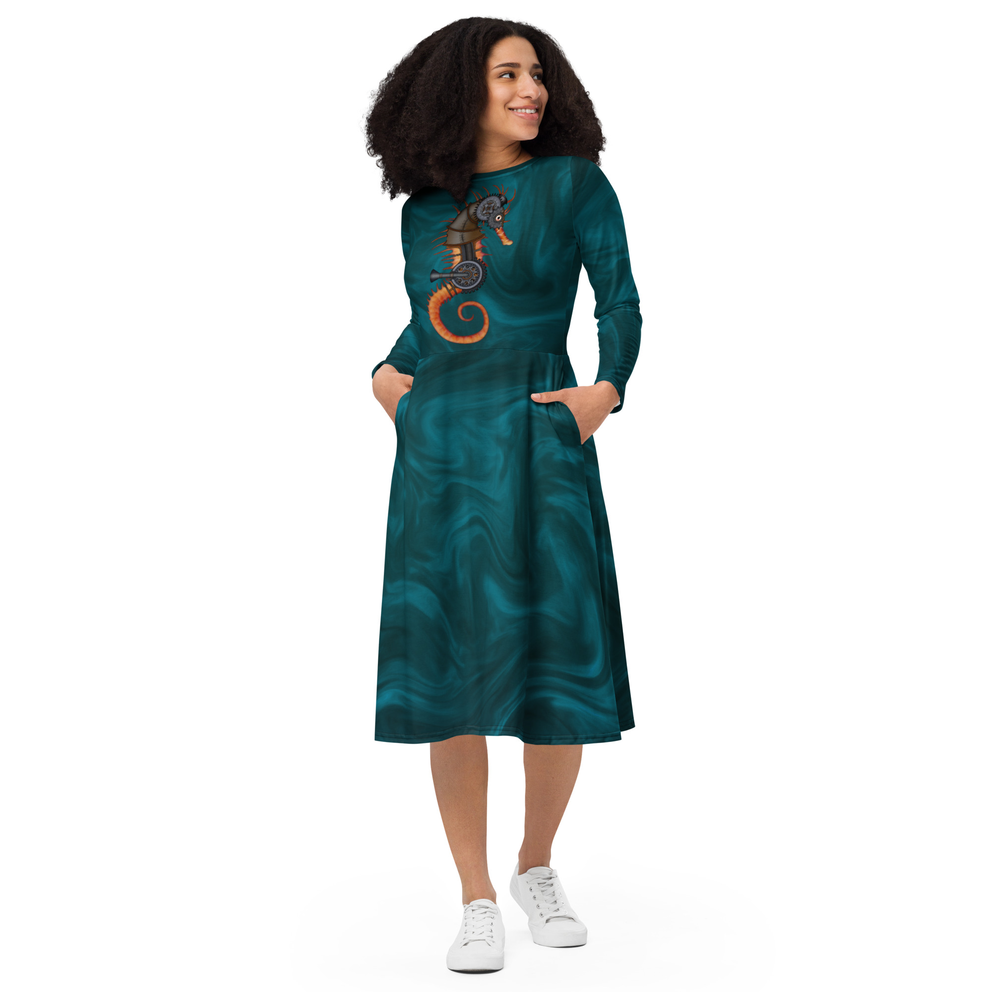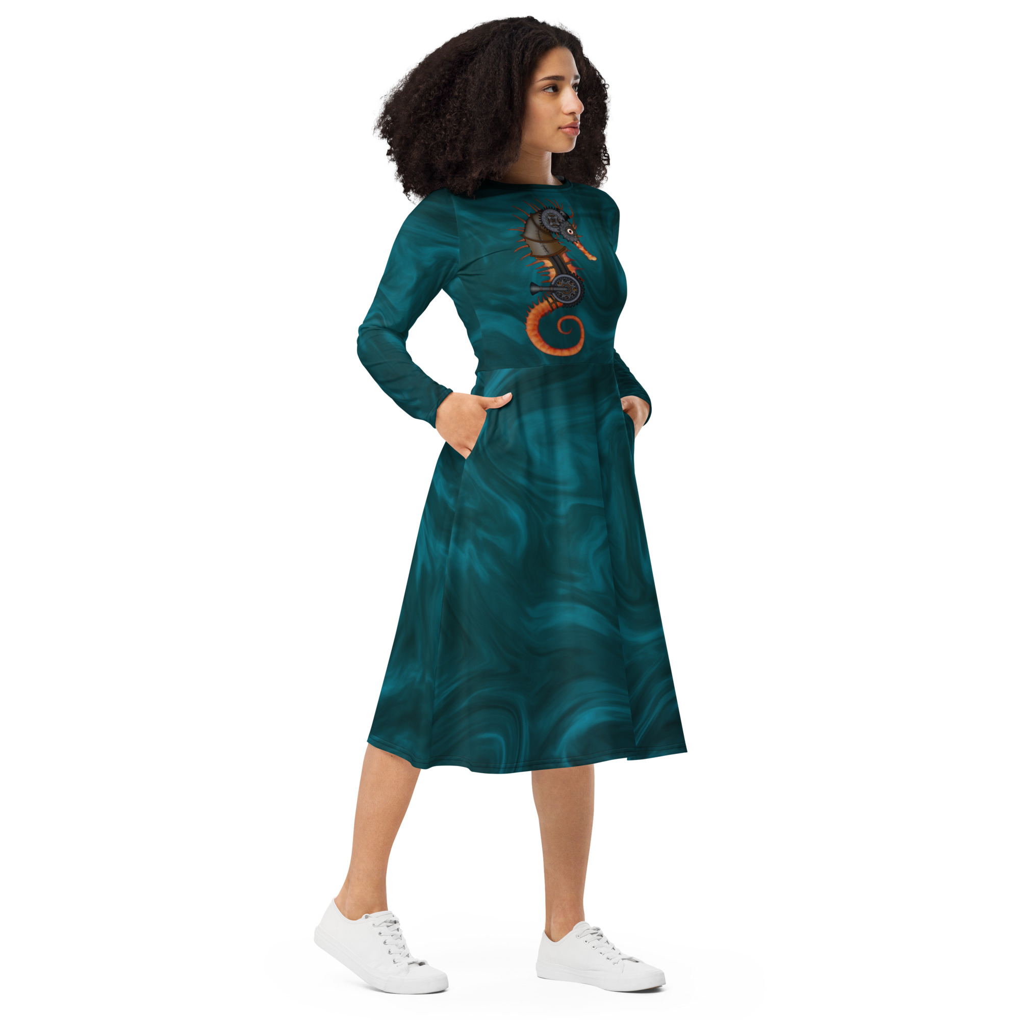CAVIS Steampunk Seahorse Midi Style Dress, Dark Green Sea Life Long Sleeve Dress