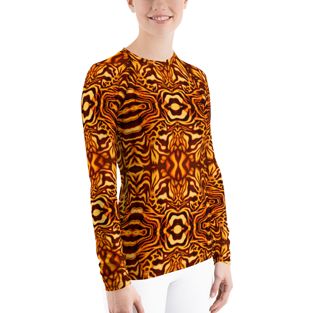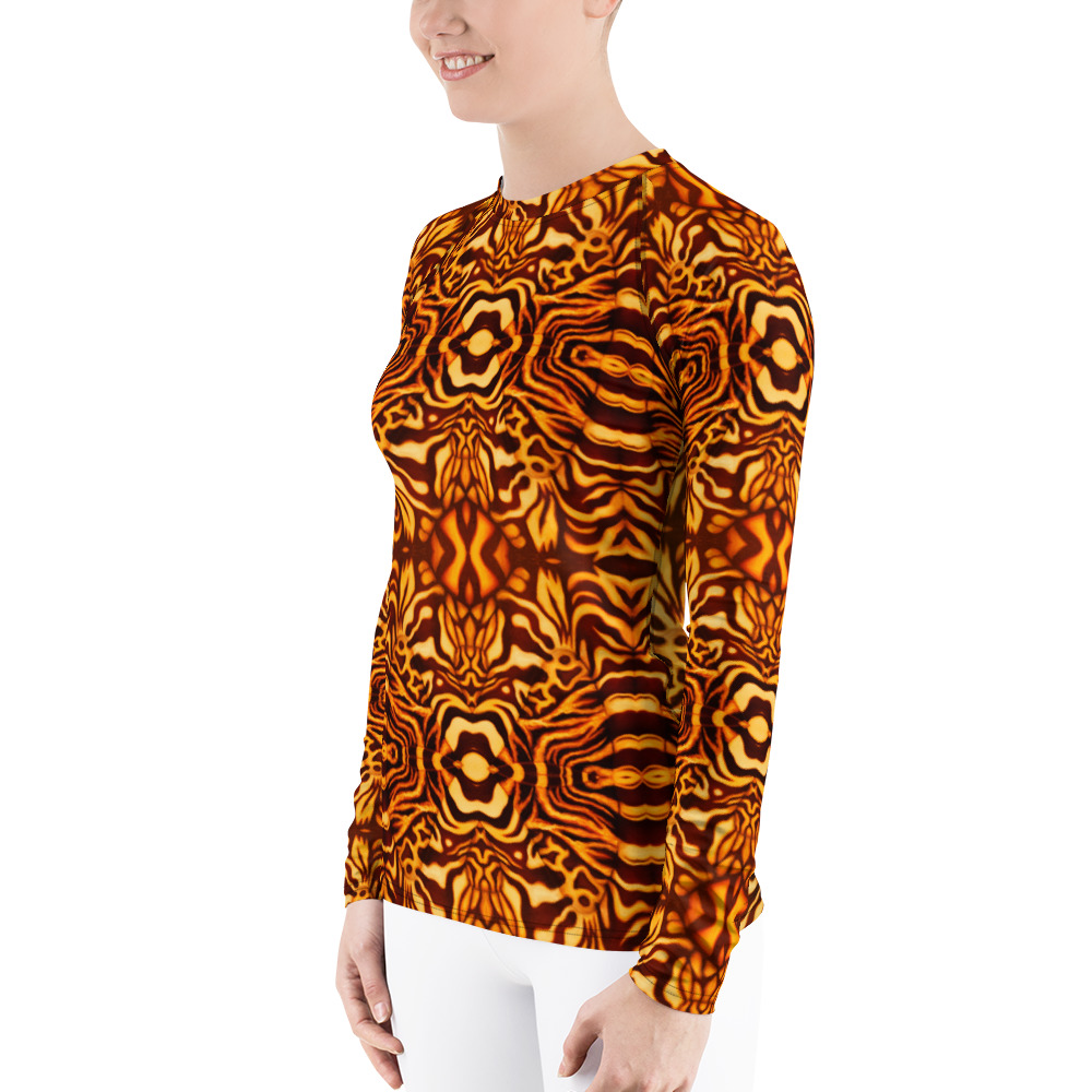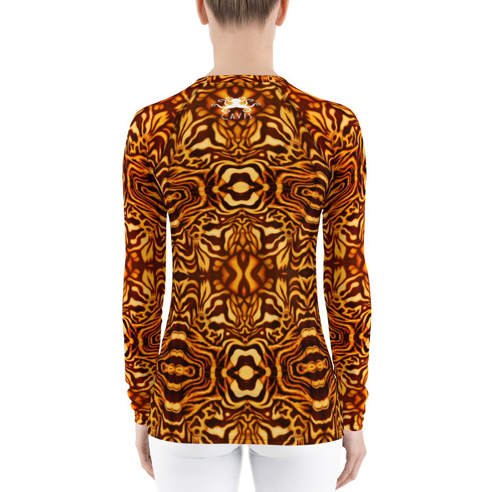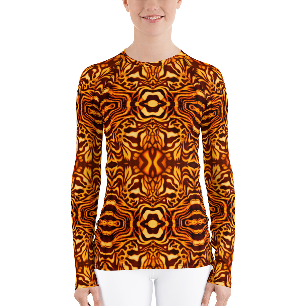 This unique octopus pattern yellow and orange rash guard will really stand out, and protect your skin. Geared towards marine and underwater enthusiasts like scuba divers! Don’t be afraid to be your most active self in this smooth and versatile long-sleeve rash guard! It protects you from the sun, wind, and other elements while doing sports, and the slim fit, flat ergonomic seams, and the longer body gives extra comfort. Great for scuba diving, snorkeling, surfing, paddle boarding, kayaking, swimming, parasailing, and any other water sport! Very soft four-way stretch fabric that stretches and recovers on the cross and lengthwise grains. Pair with matching leggings for a more versatile dive skin.